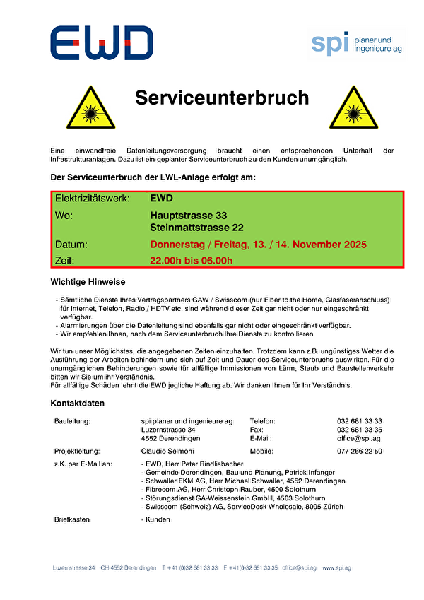 Serviceunterbruch der LWL-Anlage an der Hauptstr. 33 und Steinmattstr. 22, am DO, 13.11. ab 22:00 bis FR, 14.11. um 6:00 Uhr